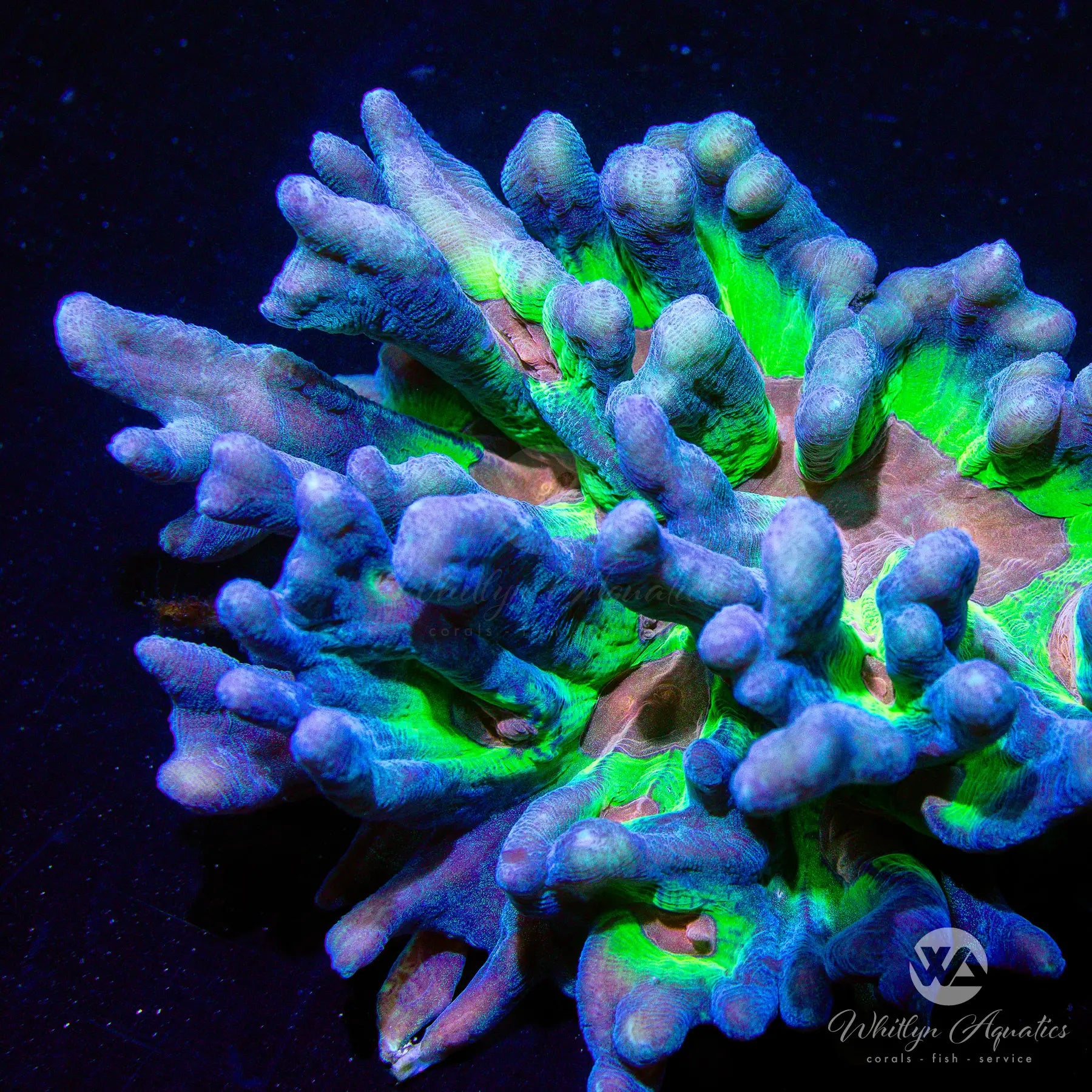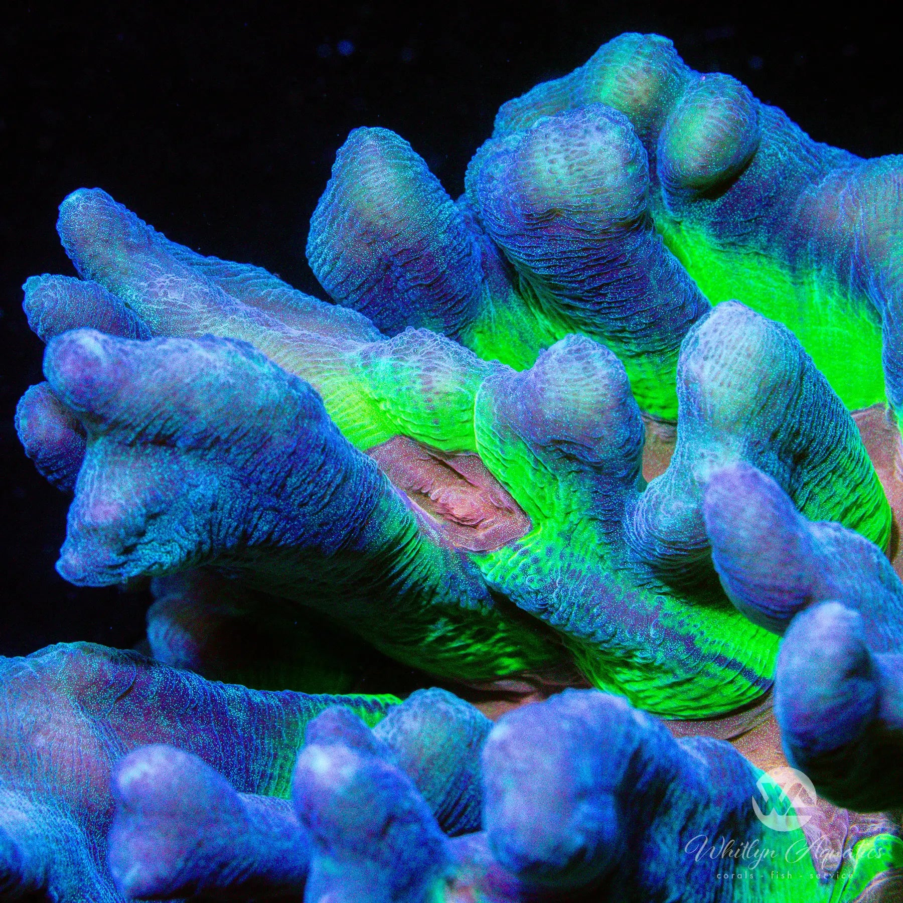 The Rainbow Pectinia showcases a dark red mouth and center, surrounded by vibrant green tissue and a blue-green outer edge, creating a bold and colorful contrast. This LPS coral does well under moderate light and moderate, indirect flow. Moderate in care, it grows in an encrusting to plating formation and should be placed with room to expand. Its unique coloration and texture make it a standout piece in any reef display.