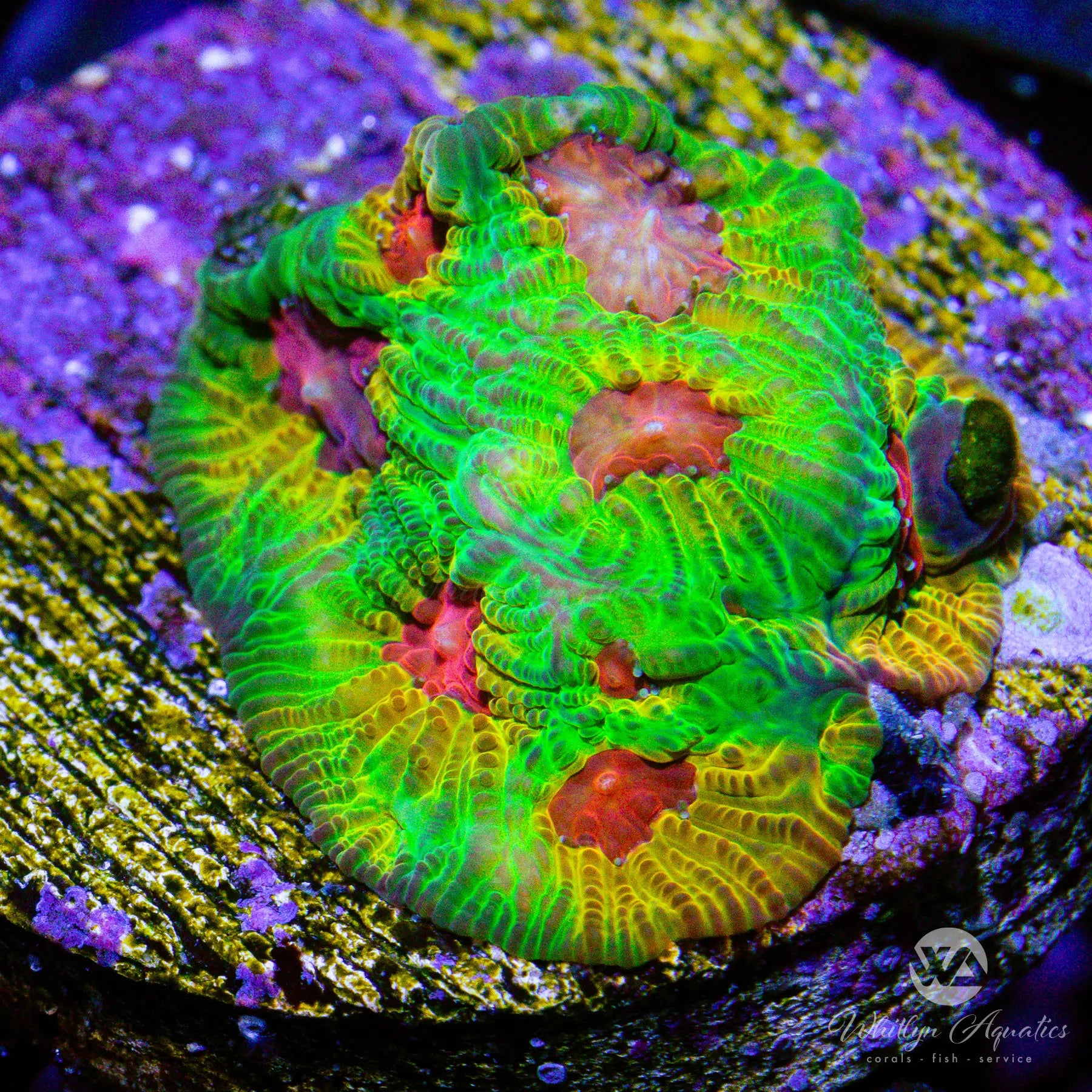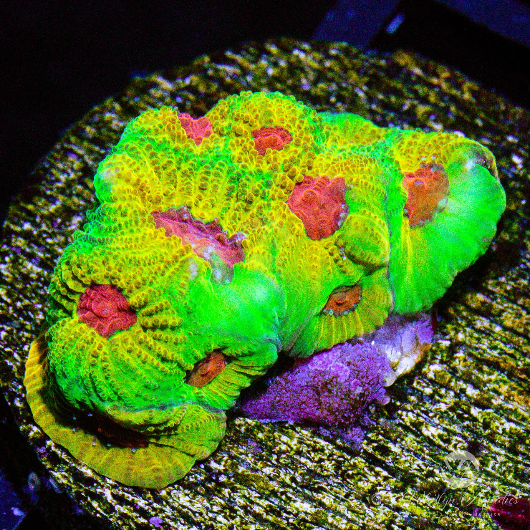 Fascination Favia displays bold red centers surrounded by an exterior blend of lime green and gold, creating a vibrant and eye-catching look. This encrusting coral thrives in moderate light and low to moderate flow, is easy to care for, and adds a stunning burst of color and texture to reef tanks of any size.