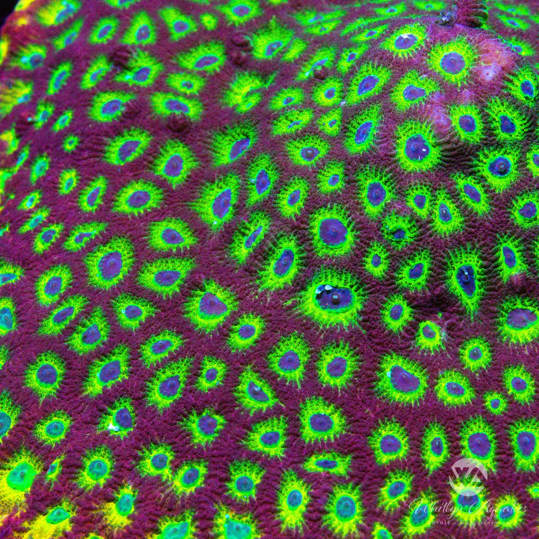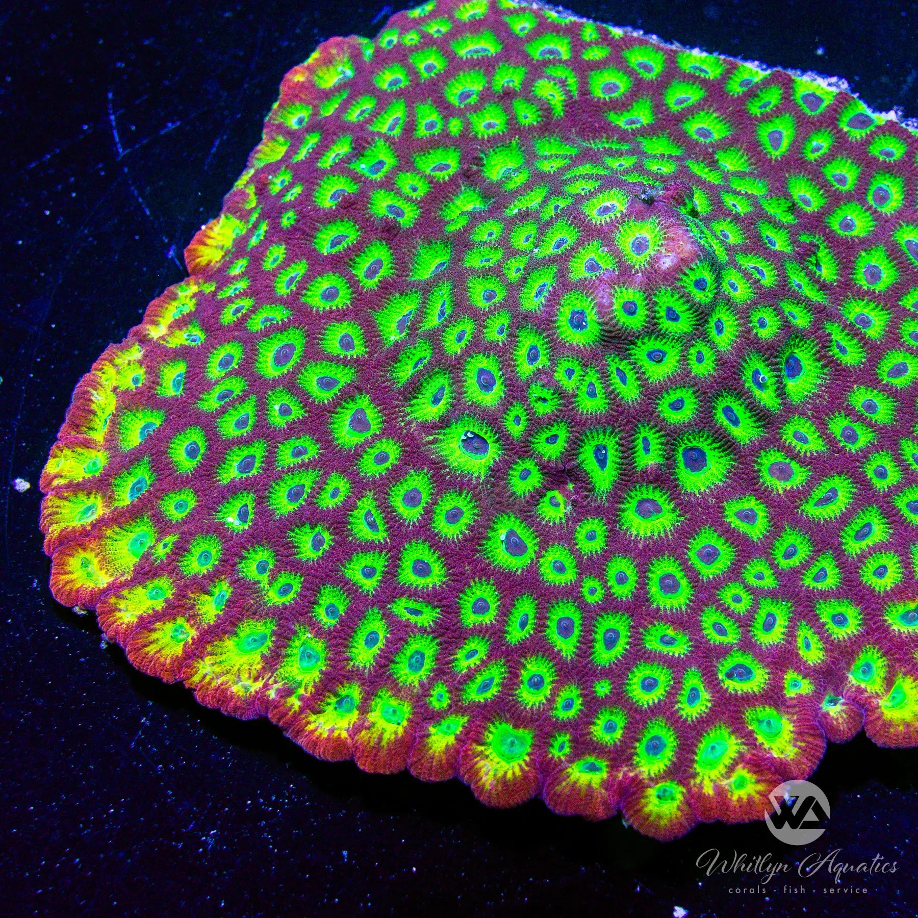 The WA Bullet Hole Favia displays a vibrant red exterior with concentric rings of yellow-green and purple radiating from the center of each polyp. It prefers moderate light and low to moderate flow, and is easy to care for, making it suitable for most reef tanks. This coral grows in a mounding encrusting pattern and adds bold color and texture to your aquascape.