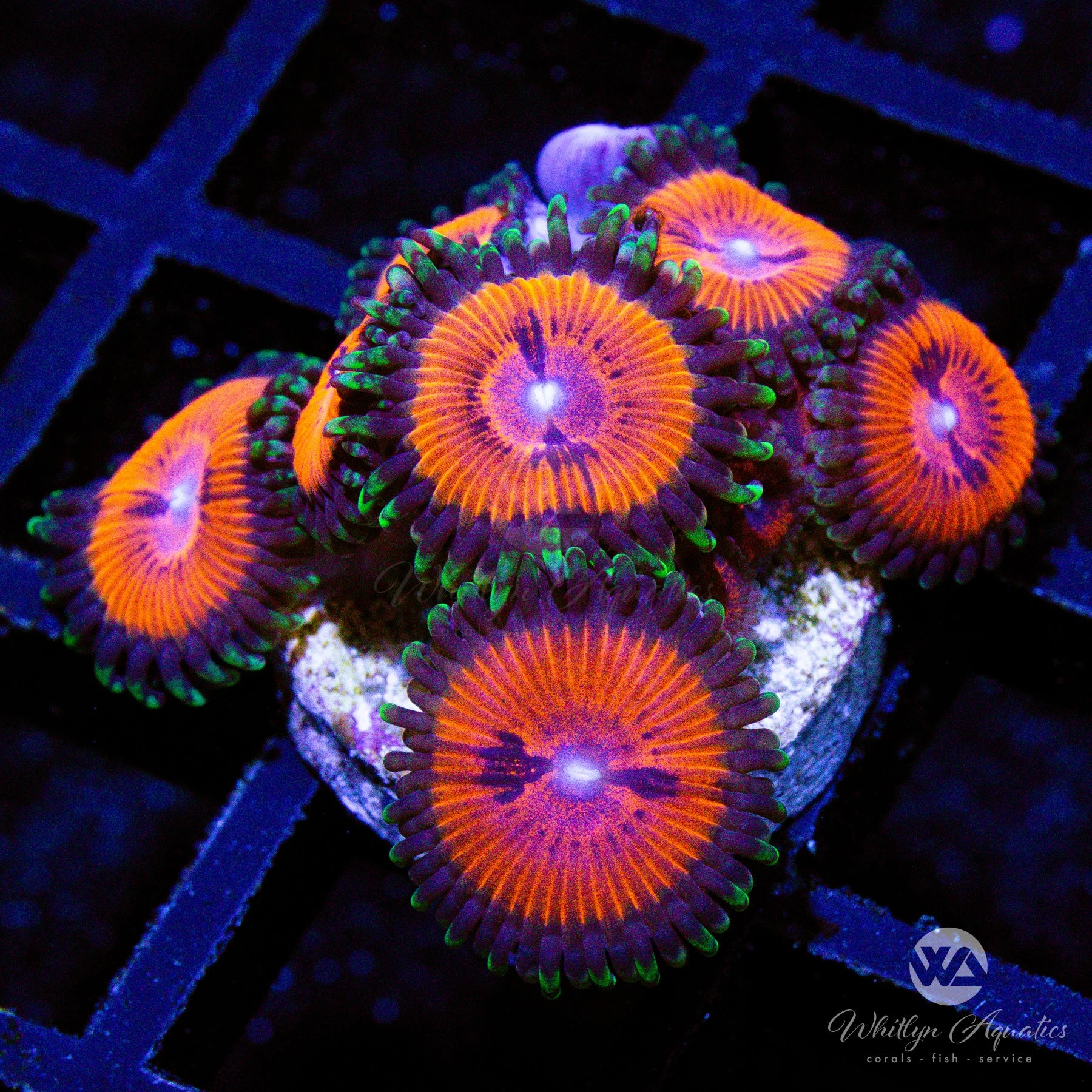 The Bloodsucker Zoanthid features a fiery orange center with a white mouth flanked by two dark patches radiating from each side. The skirt features alternating bands of purple and gold, creating a sharp, attention-grabbing look. Its intense coloration gives it the bold nickname “Bloodsucker,” making it a favorite among collectors. This hardy zoa thrives in moderate light and flow and is easy to care for. It spreads in a matting growth pattern, making it an excellent choice for adding vivid color and texture to any reef aquarium.
