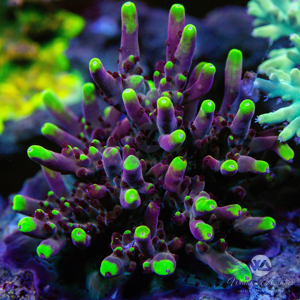 Fox Flame Acropora is a highly sought-after SPS coral that’s become a true modern classic in the reefing world. It features deep purple flesh accented by bright yellow-green tips, creating a fiery contrast that lives up to its name. Under strong lighting, this coral glows with intensity and develops incredible depth of color, making it a top choice for collectors looking to add a bold, high-end piece to their Acropora lineup.
