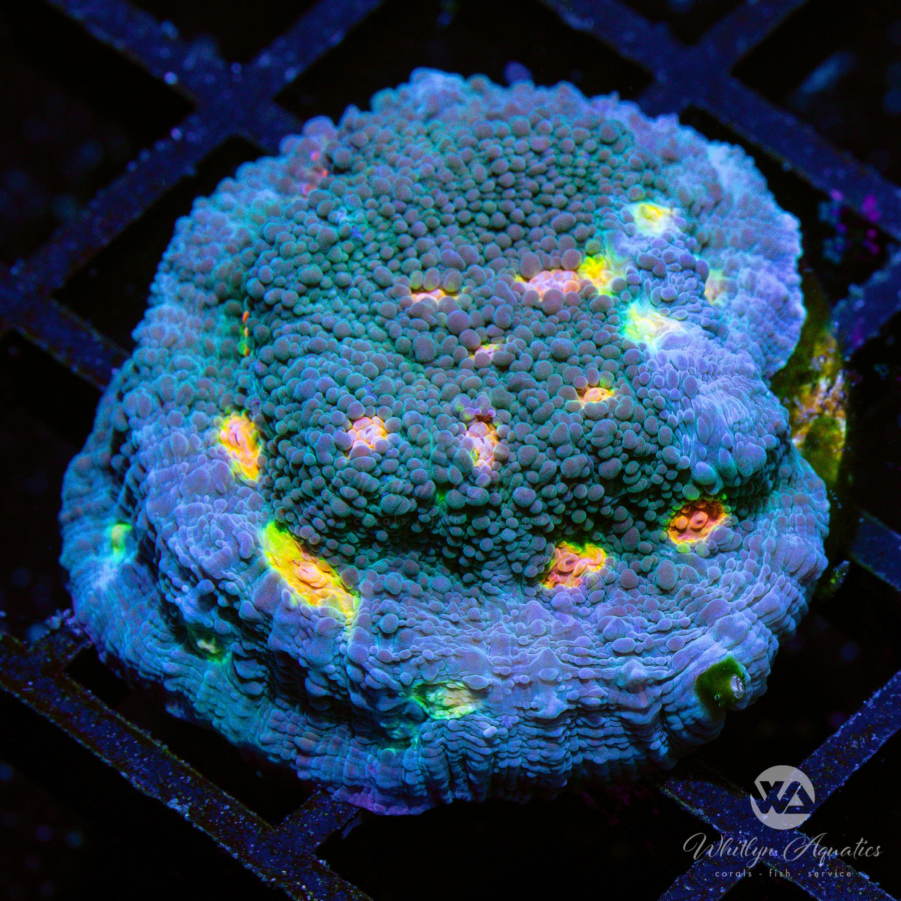 The Miami Hurricane Chalice displays a vivid blue base flesh accented by striking mouths in bright orange, yellow, and green, creating a stunning multicolor appearance. This eye-catching LPS coral thrives in low to moderate light and low to moderate flow. It has a moderate care level, making it suitable for hobbyists with some experience. Its encrusting growth pattern allows it to form colorful plates over rock, adding bold color and texture to reef aquariums.