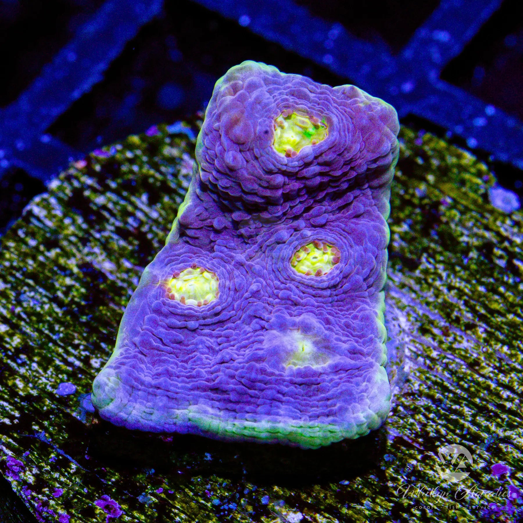 The WA Easter Egg Chalice features a vibrant purple base contrasted by bright yellow mouths and a striking yellow outer ring, giving it a festive, high-impact look. Its coloration resembles the pastel and vivid tones of dyed Easter eggs, which inspired its name. This chalice thrives in low to moderate light and moderate flow, making it well-suited for most reef setups. It grows in an encrusting pattern and is considered easy to moderate in care, making it a great choice for reefers looking to add bold, colorful contrast to lower areas of the tank.