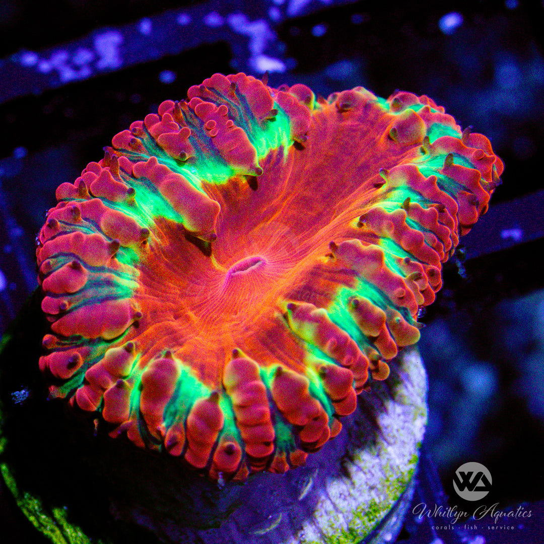 Blastomussa corals, commonly known as Blastos, are stunning and versatile additions to reef aquariums. These corals belong to the family Mussidae and are known for their large, fleshy ruffled polyps that come in a variety of vibrant colors, including reds, oranges, greens, and purples. They thrive under very low light conditions, moderate flow, and regular feedings.