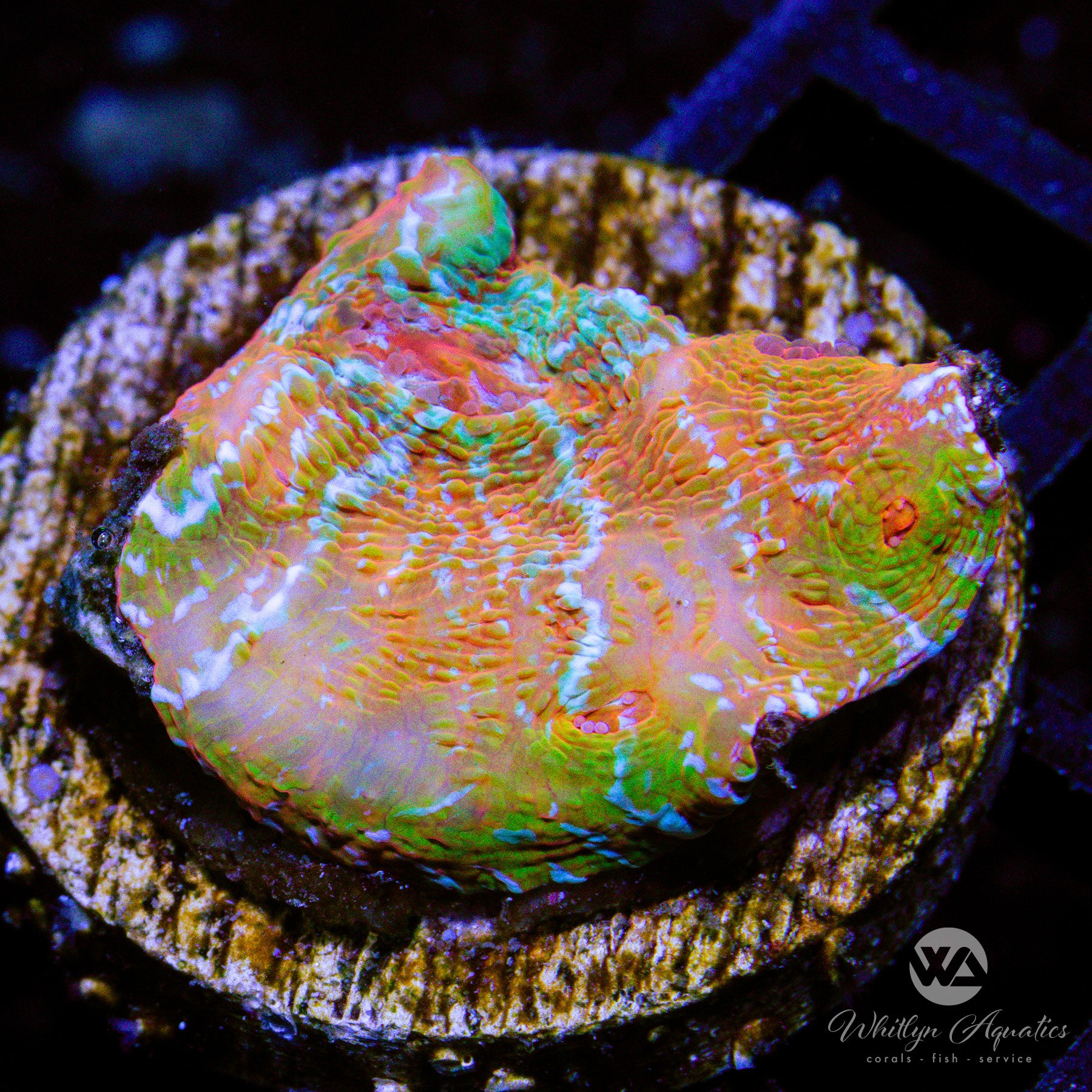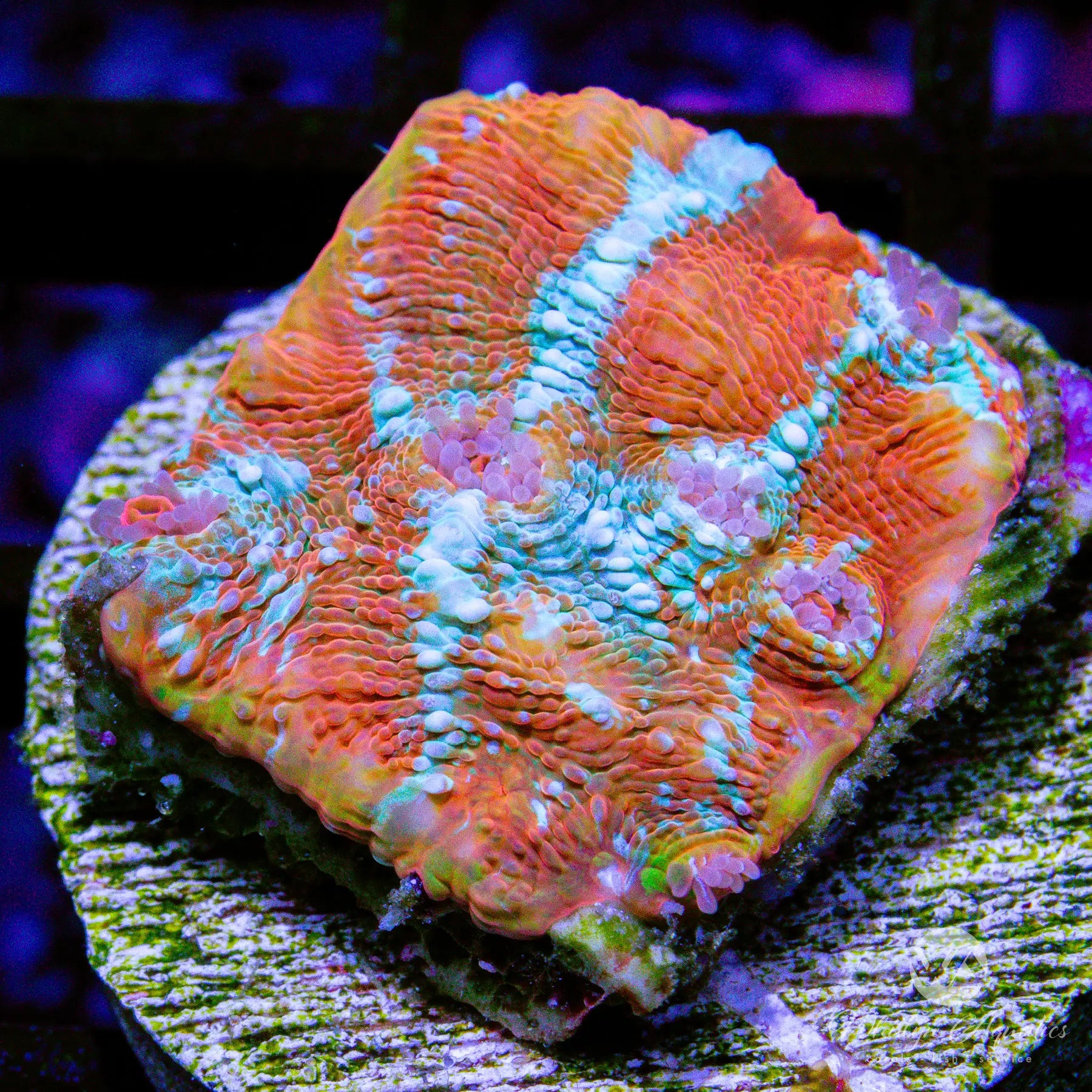 The WA Camo Chalice sports an orange base accented with bold teal streaks and blotches, giving it a distinct camouflaged appearance. This encrusting coral thrives in low to moderate light and low to moderate flow, and is considered easy to moderate to care for. Its unique coloration and growth pattern make it a standout addition to any reef aquarium.