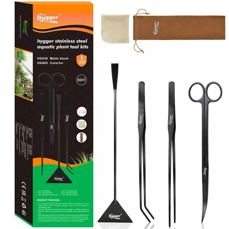 This Hygger long stainless steel aquarium tool set is designed to make aquascaping, planting, and maintenance easier and more precise. Made from premium stainless steel with a protective black coating, the tools offer excellent grip, corrosion resistance, and long-term durability. The set includes curved scissors for controlled trimming, straight and curved tweezers for accurate planting and feeding, and a sand spatula for smoothing substrate and removing debris. A cleaning cloth and drawstring bag are included for convenient maintenance and storage, making this kit ideal for both beginner and experienced aquarium hobbyists.