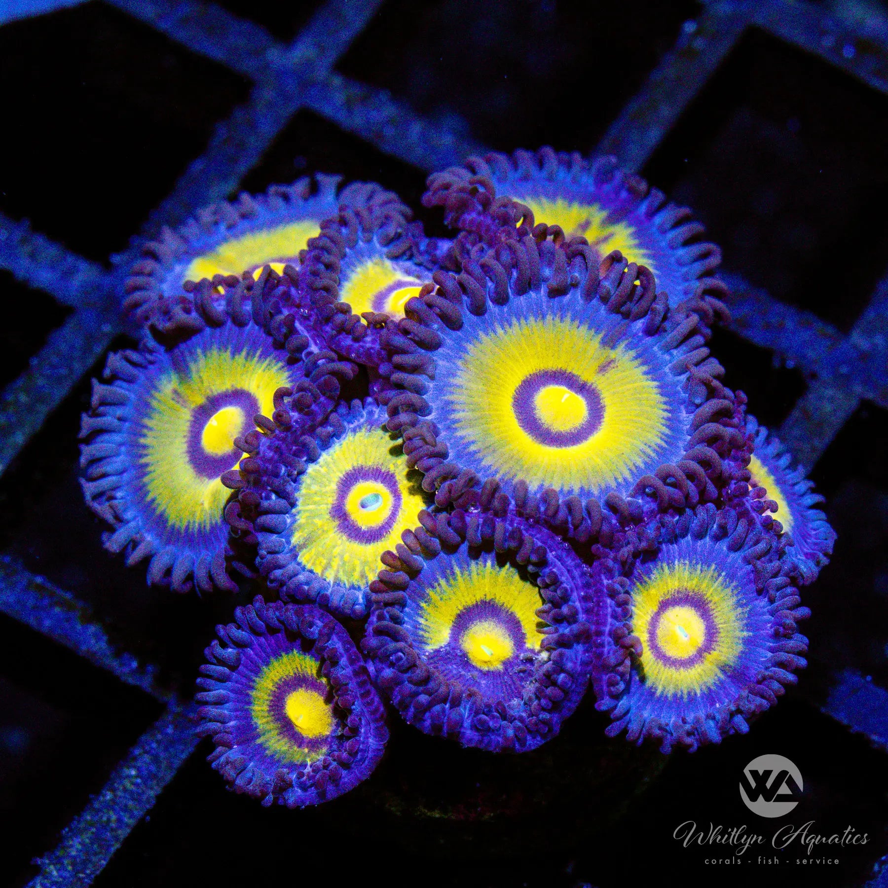 The Outcast Zoanthid features a striking color combination with concentric rings of golden yellow, purple, and blue. Its bold palette sets it apart in any zoa collection. These zoanthids thrive in moderate light and moderate flow and are easy to care for, making them a great choice for reefers of all experience levels. They grow outward in a mat-like fashion, spreading across rockwork over time.